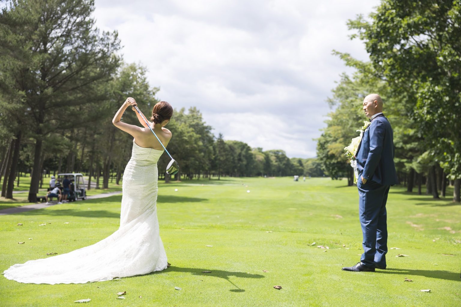 ゴルフがお好きなおふたり。ファーストミートは、同敷地内にある「ニドムクラシックコース」のグリーン上で。
