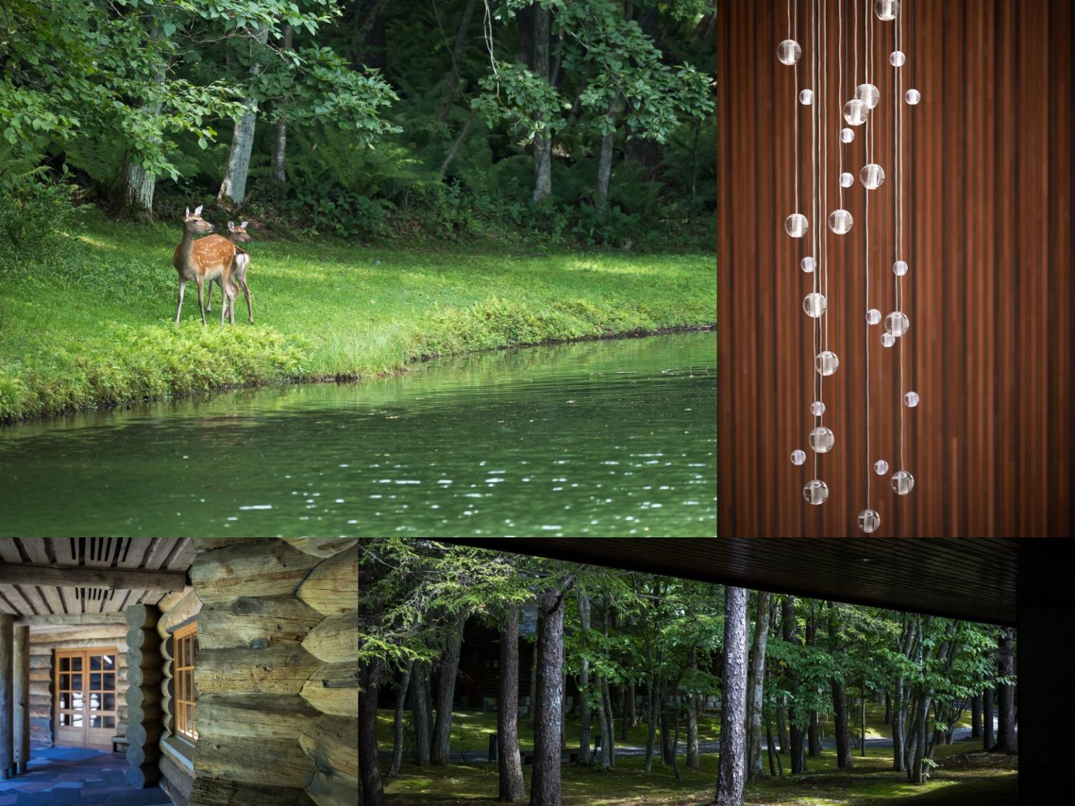 希少な木材を丁寧に重ねてつくられた空間は、森と静かに呼応するあたたかな佇まい。