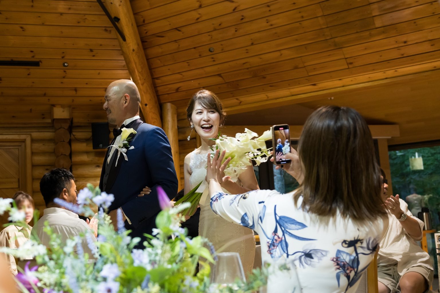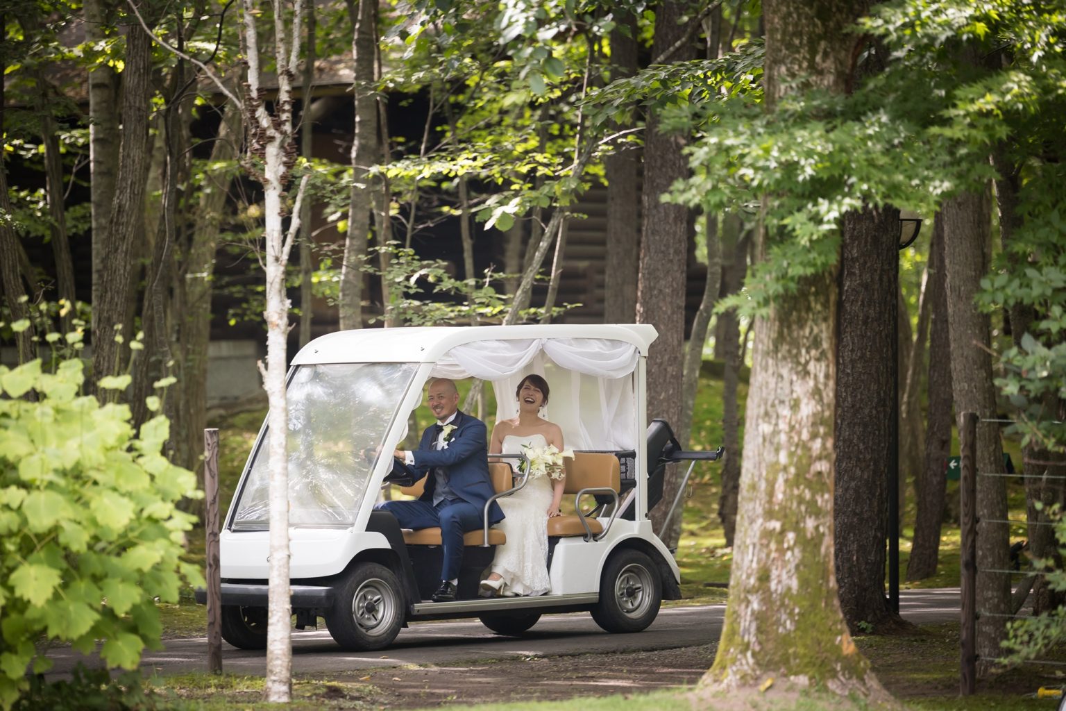ゴルフカートに乗った入場は、ゴルフ場があるニドムならではの演出。思いがけない登場に、ゲスト様から大きな歓声が上がります。