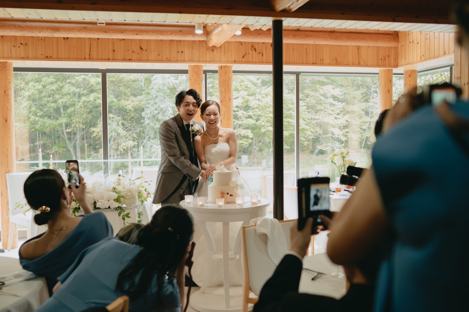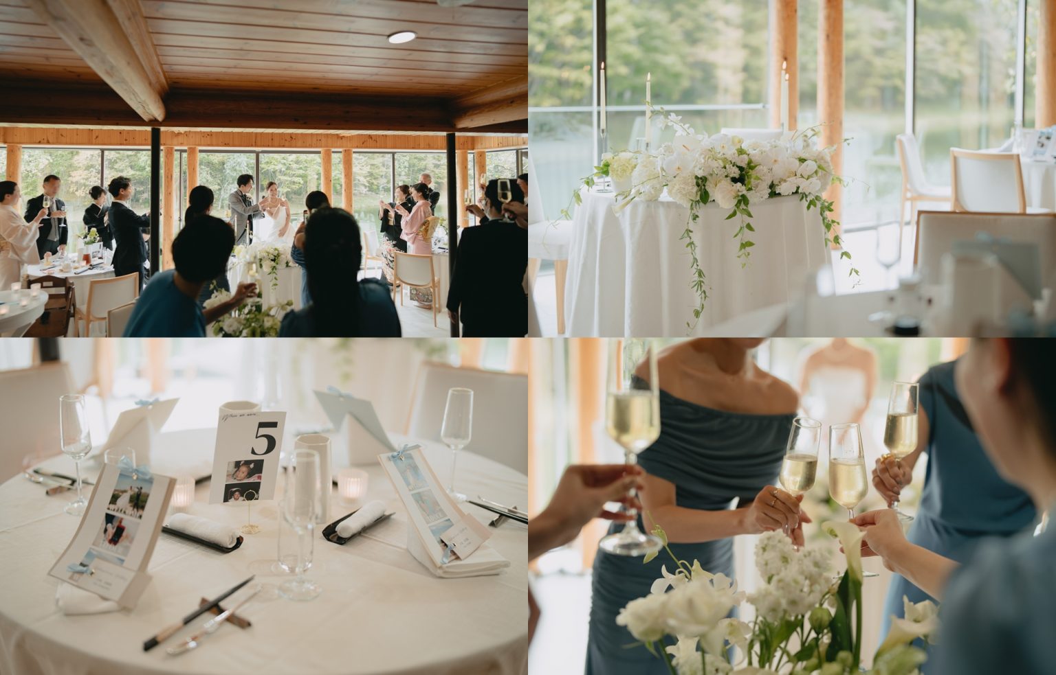 三面採光の窓から雄大な森と湖のパノラマが広がる水のテラスでのパーティーは、まるで別荘にゲストを招いたかのような、あたたかな空間。