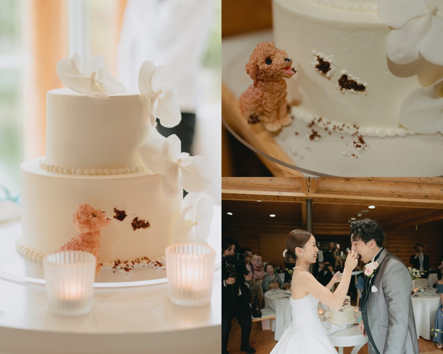 新婦様のご実家で大切にされていたトイプードルをモチーフにしたマジパン。まるでケーキにいたずらをして、クリームが鼻についているような愛らしいデザインです。